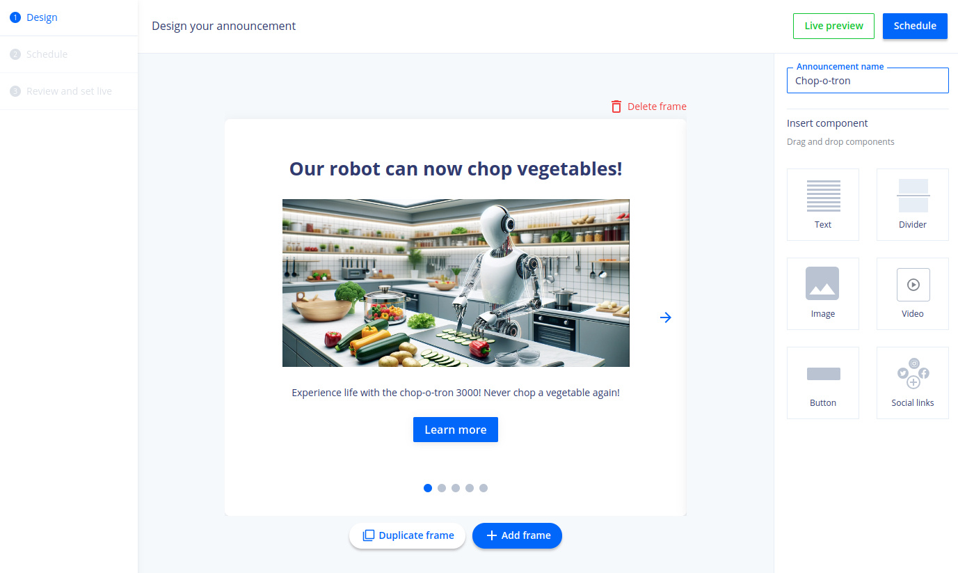 Our drag-and-drop editor makes it easy to create announcements that exactly match your style and branding.